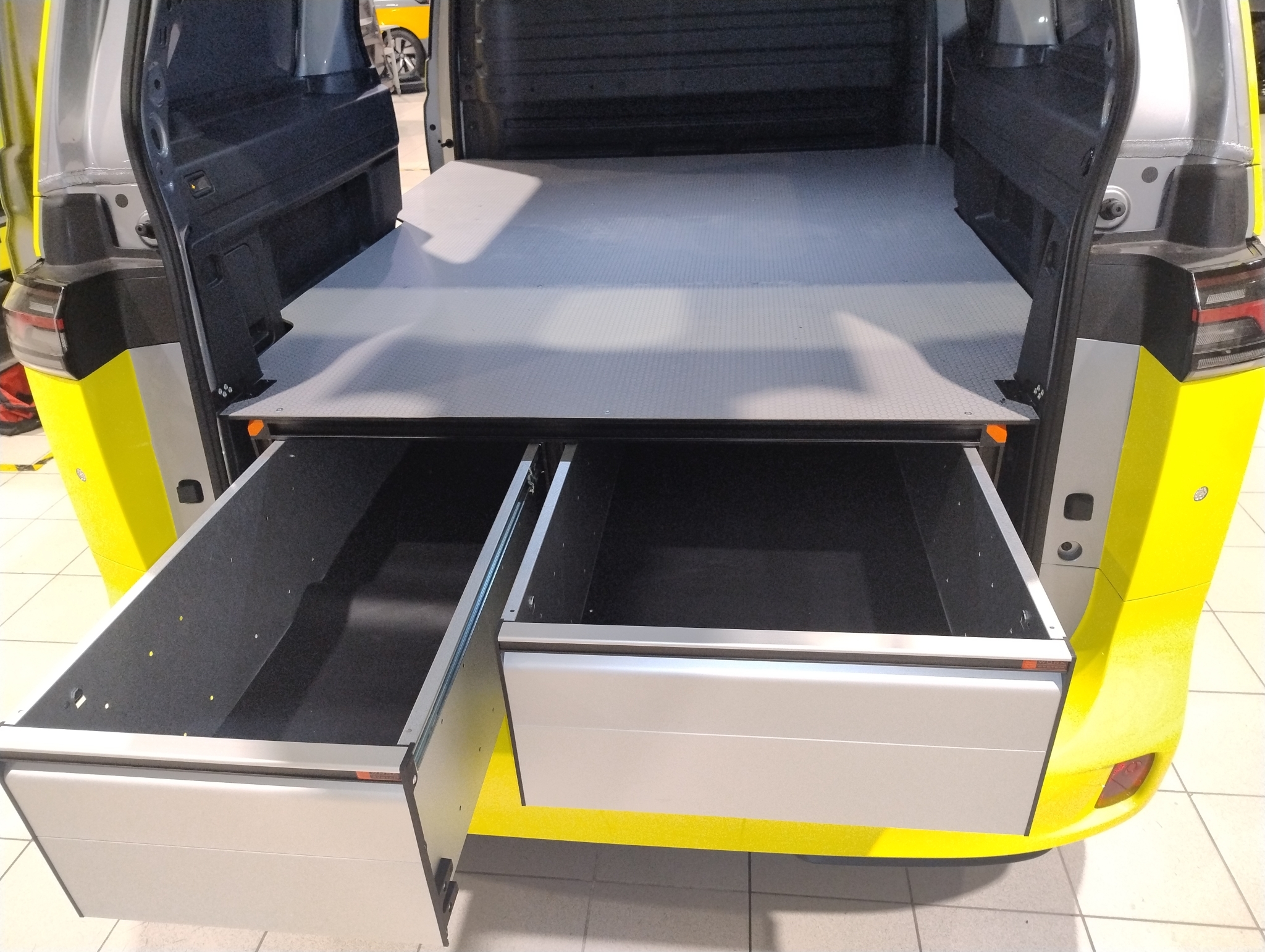 I varerommet er det montert et dobbeltgulv fra Work System, med to skuffer ut bakluka og en skuffe ut høyre skyvedør. Skuffene har en innvendig lastehøyde på 27 cm, som dermed gir rom for oppbevaring av mye utstyr. Med en lengde på 123 cm kan man oppbevare spader, spett eller andre lange verktøy, og fordelen med en dobbeltgulvløsning er at utstyret «gjemmes bort» under gulvet. Det frigir dermed plass oppå gulvet til andre materialer, samtidig som varerommet ser tomt ut fra utsiden som igjen gir en ekstra sikkerhet i form av tyverisikring. Dobbeltgulvet er utviklet i aluminium som gir maksimal vektutnyttelse, og Work Systems produkter er omfattende kollisjonstestet, og er blant markedets tryggeste løsninger dersom uhellet skulle være ute.